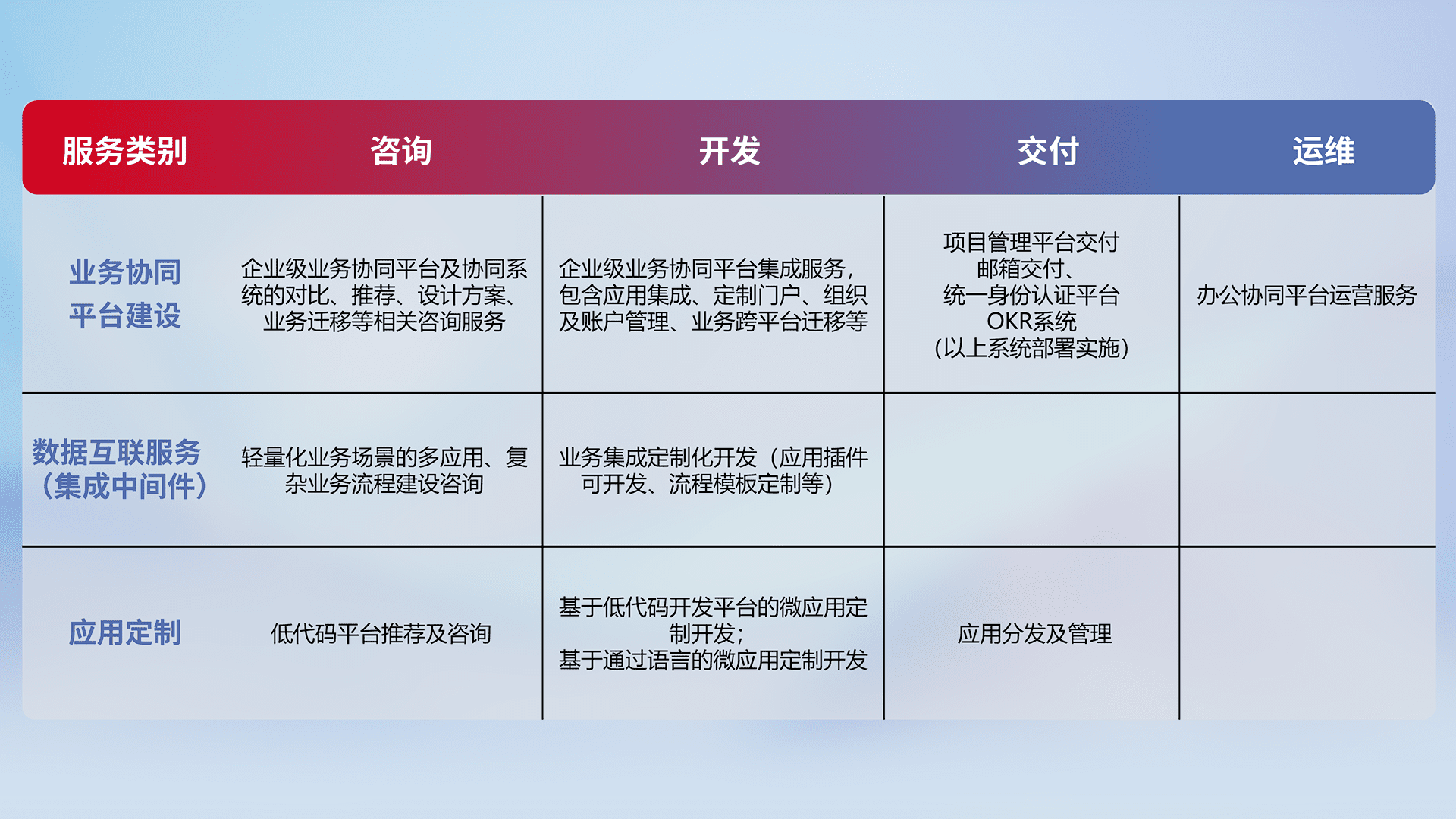 针对钉钉、、、、企微、、、IDaas等平台级产品提供产品的规划、、、、方案、、、交付、、、、定制化开发等服务,,,实现如统一协同办公、、智能客户服务、、混合会议管理、、、、智能数据查询、、、、等业务场景,,,,实现数字化转型。。。。